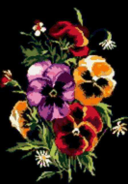 Ориентировочно так, схема вышивки «Unnamed-770526», созданная автором iborissova, будет выглядеть при отшиве на канве. Размер данной вышивки равен 133x190 крестов, при этом используется 49 цветов. Ключевые слова, по которым можно найти эту схему: pansies. Также, вы можете взглянуть на оригинальную картинку, соответствующую данной схеме вышивки.