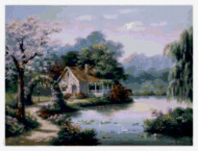 Ориентировочно так, схема вышивки «Unnamed-781331», созданная автором malkinaiv, будет выглядеть при отшиве на канве. Размер данной вышивки равен 190x145 крестов, при этом используется 68 цветов. Ключевые слова, по которым можно найти эту схему: пейзаж, природа, озеро, дома, деревья, цветы. Также, вы можете взглянуть на оригинальную картинку, соответствующую данной схеме вышивки.