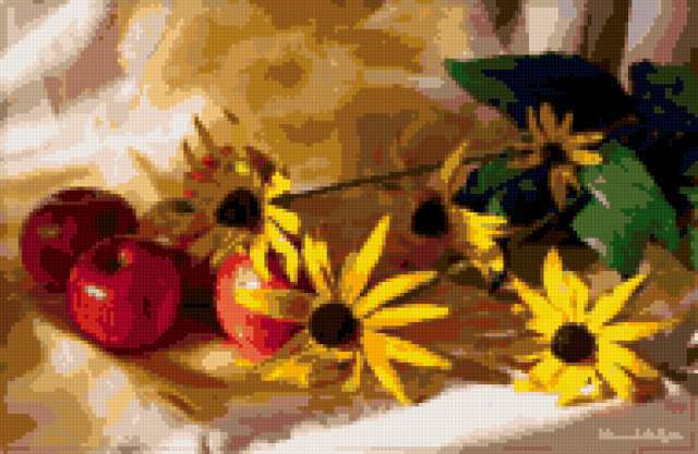 Ориентировочно так, схема вышивки «Unnamed-782191», созданная автором burova, будет выглядеть при отшиве на канве. Размер данной вышивки равен 190x124 крестов, при этом используется 41 цветов. Ключевые слова, по которым можно найти эту схему: натюрморт, цветы, фрукты, яблоки. Также, вы можете взглянуть на оригинальную картинку, соответствующую данной схеме вышивки.