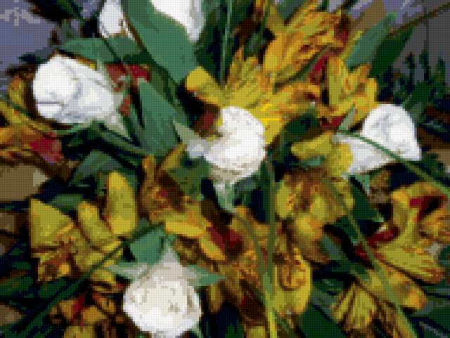 Ориентировочно так, схема вышивки «Unnamed-792376», созданная автором malkinaiv, будет выглядеть при отшиве на канве. Размер данной вышивки равен 190x143 крестов, при этом используется 62 цветов. Ключевые слова, по которым можно найти эту схему: цветы, букет. Также, вы можете взглянуть на оригинальную картинку, соответствующую данной схеме вышивки.