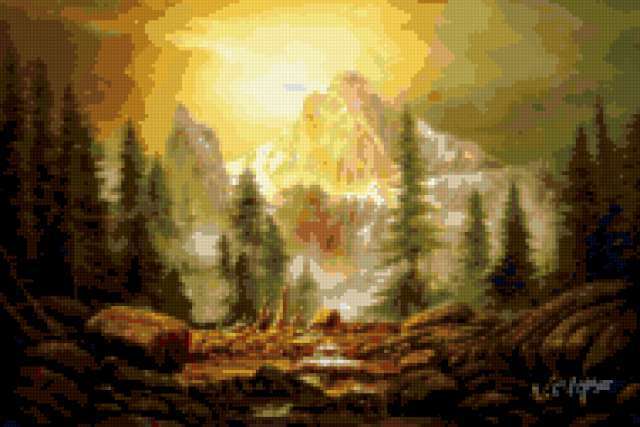 Ориентировочно так, схема вышивки «Unnamed-795069», созданная автором iborissova, будет выглядеть при отшиве на канве. Размер данной вышивки равен 190x127 крестов, при этом используется 53 цветов. Ключевые слова, по которым можно найти эту схему: landscape. Также, вы можете взглянуть на оригинальную картинку, соответствующую данной схеме вышивки.