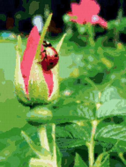 Ориентировочно так, схема вышивки «Unnamed-802826», созданная автором malkinaiv, будет выглядеть при отшиве на канве. Размер данной вышивки равен 143x190 крестов, при этом используется 45 цветов. Ключевые слова, по которым можно найти эту схему: цветы, бутон, божья коровка, насекомые. Также, вы можете взглянуть на оригинальную картинку, соответствующую данной схеме вышивки.