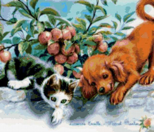 Ориентировочно так, схема вышивки «Unnamed-821970», созданная автором anor, будет выглядеть при отшиве на канве. Размер данной вышивки равен 190x163 крестов, при этом используется 63 цветов. Ключевые слова, по которым можно найти эту схему: животные, картинка, котёнок, детская, щенок, яблоки. Также, вы можете взглянуть на оригинальную картинку, соответствующую данной схеме вышивки.