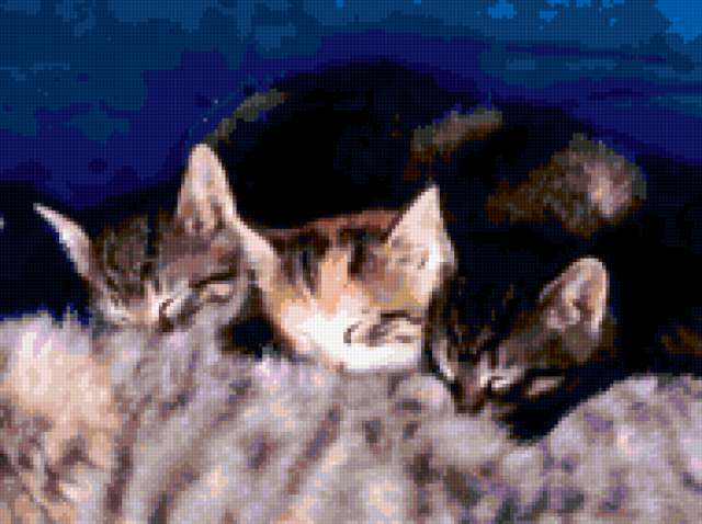 Ориентировочно так, схема вышивки «Unnamed-829133», созданная автором malkinaiv, будет выглядеть при отшиве на канве. Размер данной вышивки равен 190x142 крестов, при этом используется 44 цветов. Ключевые слова, по которым можно найти эту схему: котята, кошки, животные. Также, вы можете взглянуть на оригинальную картинку, соответствующую данной схеме вышивки.