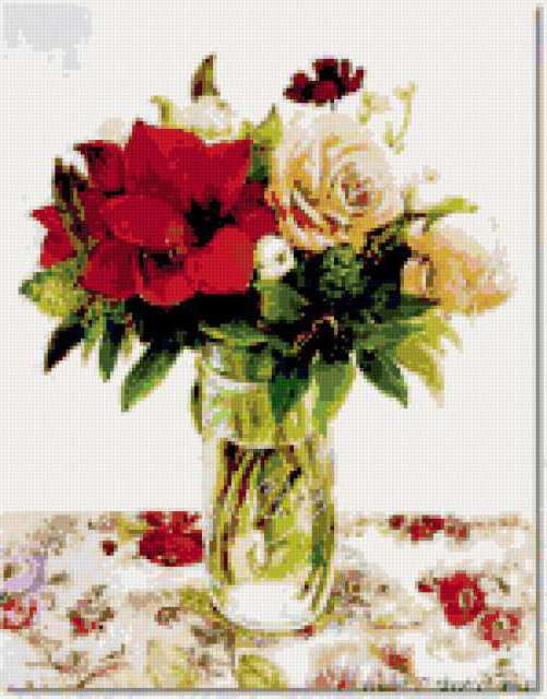 Ориентировочно так, схема вышивки «Unnamed-835741», созданная автором ayse, будет выглядеть при отшиве на канве. Размер данной вышивки равен 149x190 крестов, при этом используется 42 цветов. Ключевые слова, по которым можно найти эту схему: buket, svetq, vaza, roses. Также, вы можете взглянуть на оригинальную картинку, соответствующую данной схеме вышивки.