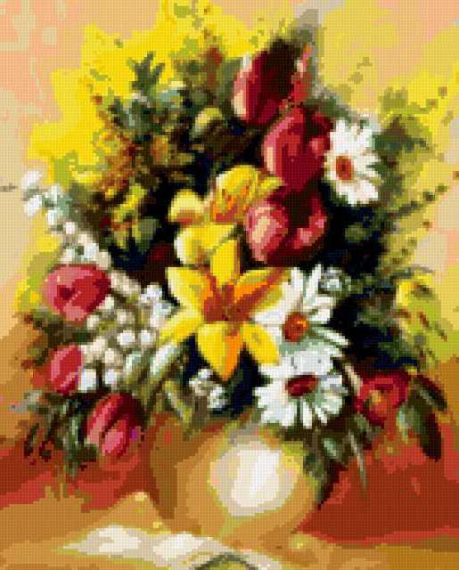 Ориентировочно так, схема вышивки «Unnamed-838185», созданная автором ayse, будет выглядеть при отшиве на канве. Размер данной вышивки равен 153x190 крестов, при этом используется 49 цветов. Ключевые слова, по которым можно найти эту схему: buket, svetq. Также, вы можете взглянуть на оригинальную картинку, соответствующую данной схеме вышивки.