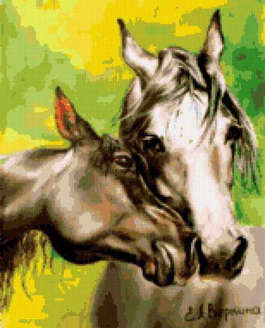 Ориентировочно так, схема вышивки «Unnamed-840543», созданная автором zarevna, будет выглядеть при отшиве на канве. Размер данной вышивки равен 154x190 крестов, при этом используется 42 цветов. Ключевые слова, по которым можно найти эту схему: картина, искусство, кони, конь, разное. Также, вы можете взглянуть на оригинальную картинку, соответствующую данной схеме вышивки.