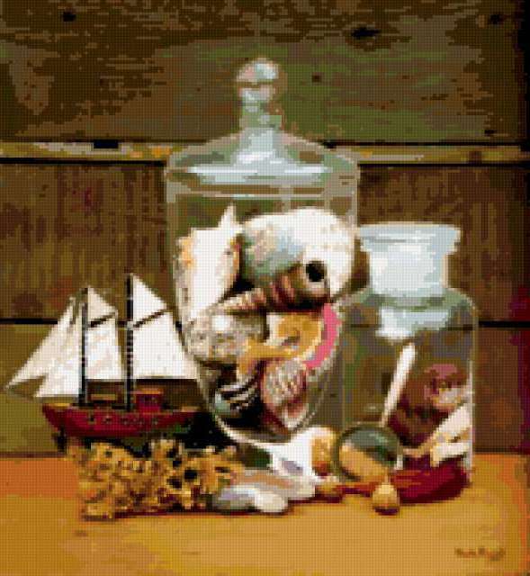 Ориентировочно так, схема вышивки «Unnamed-845778», созданная автором malkinaiv, будет выглядеть при отшиве на канве. Размер данной вышивки равен 175x190 крестов, при этом используется 50 цветов. Ключевые слова, по которым можно найти эту схему: натюрморт, море, раковины. Также, вы можете взглянуть на оригинальную картинку, соответствующую данной схеме вышивки.