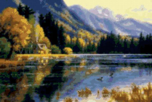 Ориентировочно так, схема вышивки «Unnamed-852689», созданная автором malkinaiv, будет выглядеть при отшиве на канве. Размер данной вышивки равен 190x128 крестов, при этом используется 56 цветов. Ключевые слова, по которым можно найти эту схему: пейзаж, осень, озеро, деревья, горы, дома, отражения. Также, вы можете взглянуть на оригинальную картинку, соответствующую данной схеме вышивки.