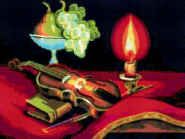 Ориентировочно так, схема вышивки «Unnamed-860603», созданная автором anor, будет выглядеть при отшиве на канве. Размер данной вышивки равен 190x143 крестов, при этом используется 60 цветов. Ключевые слова, по которым можно найти эту схему: натюрморт, фрукты, скрипка, свеча, картина, книга. Также, вы можете взглянуть на оригинальную картинку, соответствующую данной схеме вышивки.