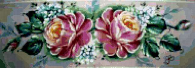Ориентировочно так, схема вышивки «Unnamed-888089», созданная автором eldi_22, будет выглядеть при отшиве на канве. Размер данной вышивки равен 190x67 крестов, при этом используется 66 цветов. Ключевые слова, по которым можно найти эту схему: розы, цветы. Также, вы можете взглянуть на оригинальную картинку, соответствующую данной схеме вышивки.