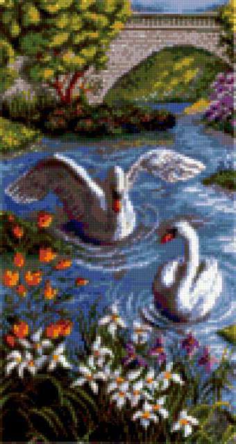 Ориентировочно так, схема вышивки «Unnamed-898877», созданная автором anor, будет выглядеть при отшиве на канве. Размер данной вышивки равен 101x190 крестов, при этом используется 66 цветов. Ключевые слова, по которым можно найти эту схему: птицы, лебеди, картина, пара, лебедь. Также, вы можете взглянуть на оригинальную картинку, соответствующую данной схеме вышивки.