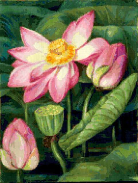 Ориентировочно так, схема вышивки «Unnamed-900334», созданная автором eldi_22, будет выглядеть при отшиве на канве. Размер данной вышивки равен 143x190 крестов, при этом используется 76 цветов. Ключевые слова, по которым можно найти эту схему: лотос, цветы. Также, вы можете взглянуть на оригинальную картинку, соответствующую данной схеме вышивки.
