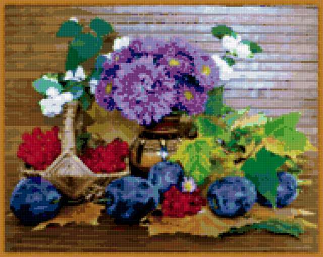 Ориентировочно так, схема вышивки «Unnamed-902092», созданная автором malkinaiv, будет выглядеть при отшиве на канве. Размер данной вышивки равен 190x151 крестов, при этом используется 84 цветов. Ключевые слова, по которым можно найти эту схему: натюрморт, цветы, букет, фрукты. Также, вы можете взглянуть на оригинальную картинку, соответствующую данной схеме вышивки.