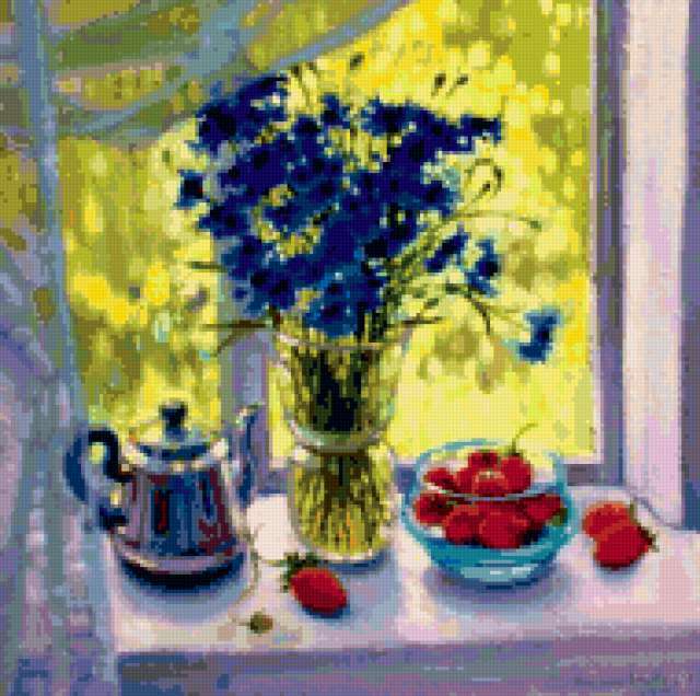 Ориентировочно так, схема вышивки «Unnamed-903394», созданная автором malkinaiv, будет выглядеть при отшиве на канве. Размер данной вышивки равен 190x189 крестов, при этом используется 79 цветов. Ключевые слова, по которым можно найти эту схему: цветы, букет, окно, васильки, ягоды. Также, вы можете взглянуть на оригинальную картинку, соответствующую данной схеме вышивки.