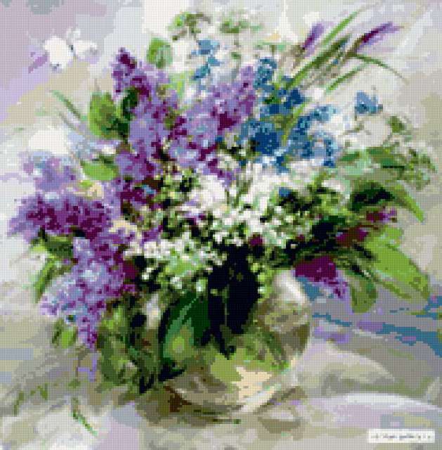 Ориентировочно так, схема вышивки «Unnamed-906036», созданная автором ayse, будет выглядеть при отшиве на канве. Размер данной вышивки равен 187x190 крестов, при этом используется 45 цветов. Ключевые слова, по которым можно найти эту схему: buket, svetq, vaza. Также, вы можете взглянуть на оригинальную картинку, соответствующую данной схеме вышивки.