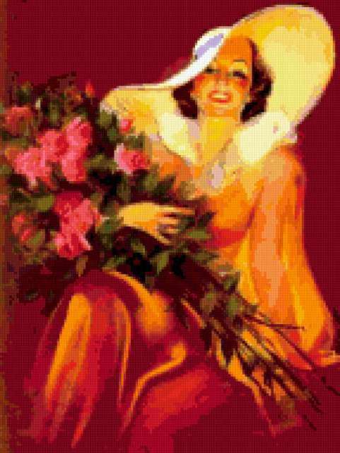 Ориентировочно так, схема вышивки «Unnamed-906233», созданная автором BiataV, будет выглядеть при отшиве на канве. Размер данной вышивки равен 143x190 крестов, при этом используется 66 цветов. Ключевые слова, по которым можно найти эту схему: она, девушка, ретро, красота, цветы, букет. Также, вы можете взглянуть на оригинальную картинку, соответствующую данной схеме вышивки.