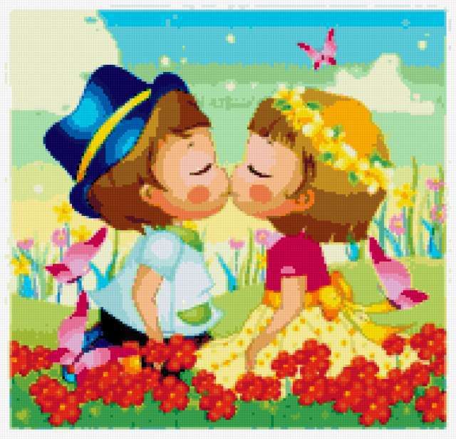 Ориентировочно так, схема вышивки «Unnamed-906672», созданная автором malkinaiv, будет выглядеть при отшиве на канве. Размер данной вышивки равен 190x183 крестов, при этом используется 58 цветов. Ключевые слова, по которым можно найти эту схему: картинки, дети, поцелуй, цветы. Также, вы можете взглянуть на оригинальную картинку, соответствующую данной схеме вышивки.