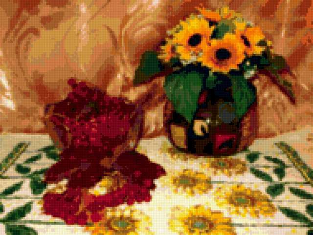 Ориентировочно так, схема вышивки «Unnamed-907941», созданная автором burova, будет выглядеть при отшиве на канве. Размер данной вышивки равен 190x143 крестов, при этом используется 59 цветов. Ключевые слова, по которым можно найти эту схему: натюрморт, цветы, букет, ягоды. Также, вы можете взглянуть на оригинальную картинку, соответствующую данной схеме вышивки.
