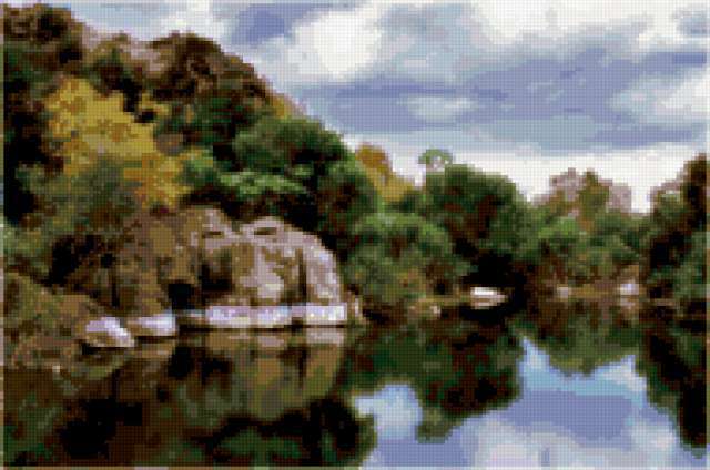 Ориентировочно так, схема вышивки «Unnamed-908450», созданная автором malkinaiv, будет выглядеть при отшиве на канве. Размер данной вышивки равен 190x126 крестов, при этом используется 42 цветов. Ключевые слова, по которым можно найти эту схему: пейзаж, озеро, берег, скалы, отражения, деревья. Также, вы можете взглянуть на оригинальную картинку, соответствующую данной схеме вышивки.