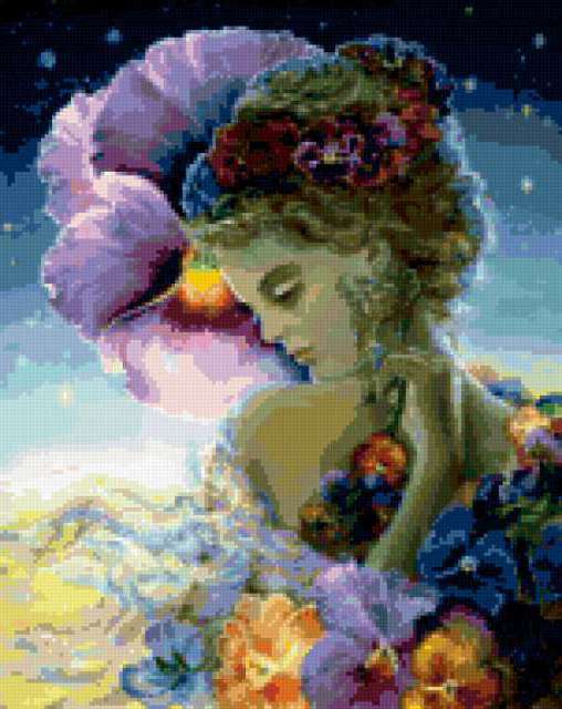 Ориентировочно так, схема вышивки «Unnamed-908769», созданная автором BiataV, будет выглядеть при отшиве на канве. Размер данной вышивки равен 151x190 крестов, при этом используется 84 цветов. Ключевые слова, по которым можно найти эту схему: она, девушка, фея, фэнтези, эльфы, фантазия, красота, жозефина уолл. Также, вы можете взглянуть на оригинальную картинку, соответствующую данной схеме вышивки.