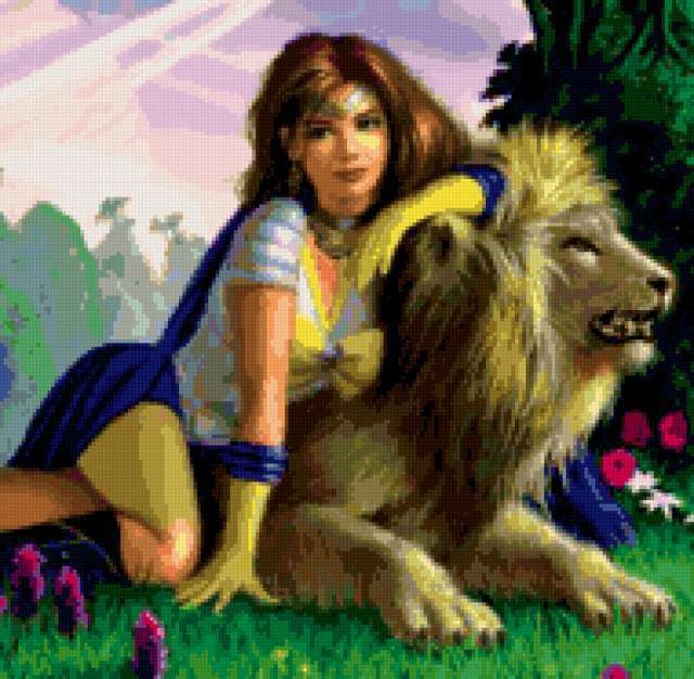 Ориентировочно так, схема вышивки «Unnamed-910071», созданная автором BiataV, будет выглядеть при отшиве на канве. Размер данной вышивки равен 190x186 крестов, при этом используется 81 цветов. Ключевые слова, по которым можно найти эту схему: девушка, воин, лев, фэнтези, магия. Также, вы можете взглянуть на оригинальную картинку, соответствующую данной схеме вышивки.