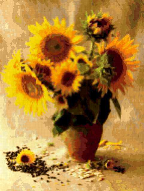 Ориентировочно так, схема вышивки «Unnamed-910908», созданная автором malkinaiv, будет выглядеть при отшиве на канве. Размер данной вышивки равен 143x190 крестов, при этом используется 56 цветов. Ключевые слова, по которым можно найти эту схему: цветы, букет, подсолнухи. Также, вы можете взглянуть на оригинальную картинку, соответствующую данной схеме вышивки.