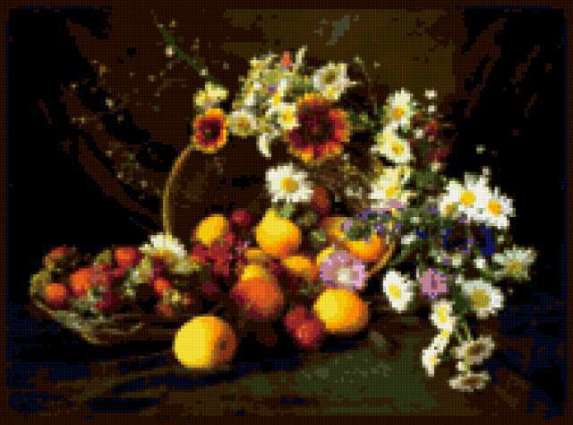 Ориентировочно так, схема вышивки «Unnamed-912830», созданная автором malkinaiv, будет выглядеть при отшиве на канве. Размер данной вышивки равен 190x141 крестов, при этом используется 55 цветов. Ключевые слова, по которым можно найти эту схему: натюрморт, цветы, букет, фрукты. Также, вы можете взглянуть на оригинальную картинку, соответствующую данной схеме вышивки.