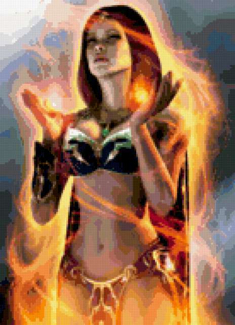 Ориентировочно так, схема вышивки «Unnamed-913087», созданная автором BiataV, будет выглядеть при отшиве на канве. Размер данной вышивки равен 138x190 крестов, при этом используется 85 цветов. Ключевые слова, по которым можно найти эту схему: фэнтези, девушка, магия, огонь. Также, вы можете взглянуть на оригинальную картинку, соответствующую данной схеме вышивки.