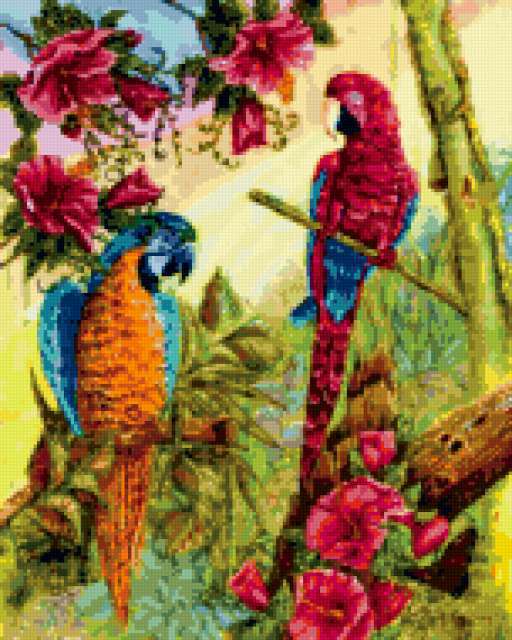 Ориентировочно так, схема вышивки «Unnamed-915464», созданная автором anor, будет выглядеть при отшиве на канве. Размер данной вышивки равен 152x190 крестов, при этом используется 82 цветов. Ключевые слова, по которым можно найти эту схему: птицы, попугаи, картина, пара, цветы. Также, вы можете взглянуть на оригинальную картинку, соответствующую данной схеме вышивки.
