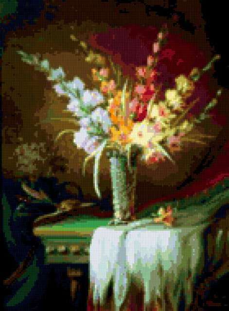 Ориентировочно так, схема вышивки «Unnamed-933209», созданная автором malkinaiv, будет выглядеть при отшиве на канве. Размер данной вышивки равен 140x190 крестов, при этом используется 66 цветов. Ключевые слова, по которым можно найти эту схему: картина, цветы, букет. Также, вы можете взглянуть на оригинальную картинку, соответствующую данной схеме вышивки.