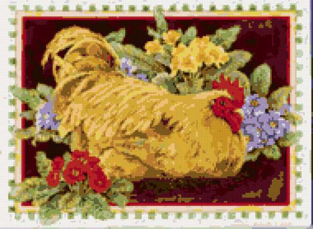 Ориентировочно так, схема вышивки «Unnamed-937476», созданная автором ze79, будет выглядеть при отшиве на канве. Размер данной вышивки равен 190x139 крестов, при этом используется 29 цветов. Ключевые слова, по которым можно найти эту схему: курица, подушка, петух, животные. Также, вы можете взглянуть на оригинальную картинку, соответствующую данной схеме вышивки.