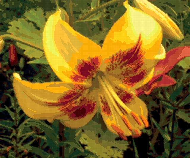 Ориентировочно так, схема вышивки «Unnamed-947539», созданная автором malkinaiv, будет выглядеть при отшиве на канве. Размер данной вышивки равен 190x158 крестов, при этом используется 46 цветов. Ключевые слова, по которым можно найти эту схему: цветы, цветок, лилии. Также, вы можете взглянуть на оригинальную картинку, соответствующую данной схеме вышивки.