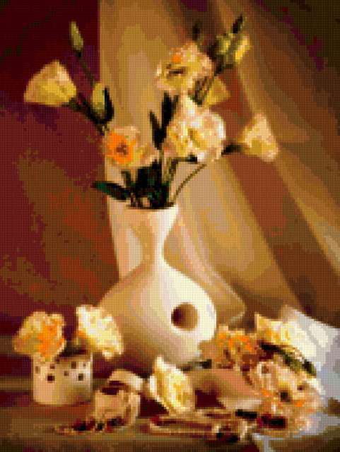 Ориентировочно так, схема вышивки «Unnamed-952322», созданная автором malkinaiv, будет выглядеть при отшиве на канве. Размер данной вышивки равен 143x190 крестов, при этом используется 68 цветов. Ключевые слова, по которым можно найти эту схему: натюрморт, цветы, букет. Также, вы можете взглянуть на оригинальную картинку, соответствующую данной схеме вышивки.