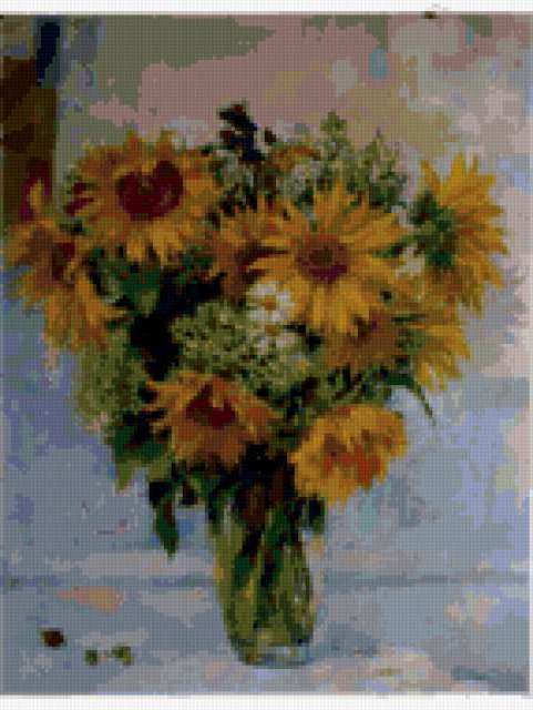 Ориентировочно так, схема вышивки «Unnamed-952787», созданная автором malkinaiv, будет выглядеть при отшиве на канве. Размер данной вышивки равен 143x190 крестов, при этом используется 70 цветов. Ключевые слова, по которым можно найти эту схему: цветы, букет, подсолнухи. Также, вы можете взглянуть на оригинальную картинку, соответствующую данной схеме вышивки.