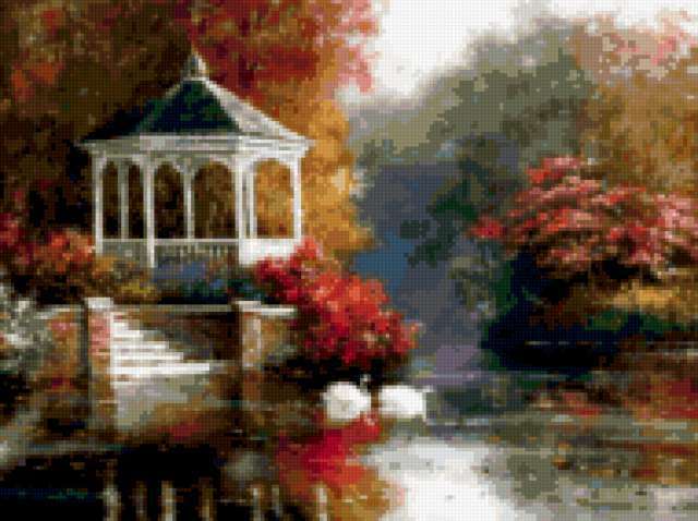 Ориентировочно так, схема вышивки «Unnamed-954610», созданная автором malkinaiv, будет выглядеть при отшиве на канве. Размер данной вышивки равен 190x142 крестов, при этом используется 76 цветов. Ключевые слова, по которым можно найти эту схему: беседка, птицы, пейзаж, лебеди, озеро, цветы. Также, вы можете взглянуть на оригинальную картинку, соответствующую данной схеме вышивки.
