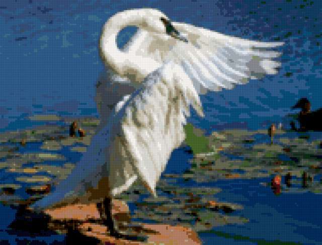 Ориентировочно так, схема вышивки «Unnamed-954635», созданная автором malkinaiv, будет выглядеть при отшиве на канве. Размер данной вышивки равен 190x145 крестов, при этом используется 48 цветов. Ключевые слова, по которым можно найти эту схему: птицы, лебеди, лебедь, озеро. Также, вы можете взглянуть на оригинальную картинку, соответствующую данной схеме вышивки.