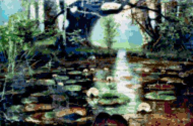 Ориентировочно так, схема вышивки «Unnamed-958576», созданная автором malkinaiv, будет выглядеть при отшиве на канве. Размер данной вышивки равен 190x125 крестов, при этом используется 49 цветов. Ключевые слова, по которым можно найти эту схему: пейзаж, природа, озеро, цветы, лилии, деревья. Также, вы можете взглянуть на оригинальную картинку, соответствующую данной схеме вышивки.