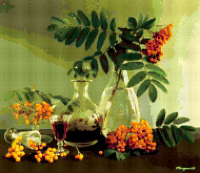 Ориентировочно так, схема вышивки «Unnamed-963775», созданная автором malkinaiv, будет выглядеть при отшиве на канве. Размер данной вышивки равен 190x165 крестов, при этом используется 50 цветов. Ключевые слова, по которым можно найти эту схему: натюрморт, ягоды, рябина, вино, букет. Также, вы можете взглянуть на оригинальную картинку, соответствующую данной схеме вышивки.