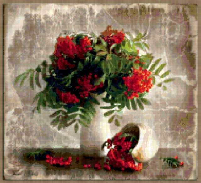 Ориентировочно так, схема вышивки «Unnamed-965197», созданная автором malkinaiv, будет выглядеть при отшиве на канве. Размер данной вышивки равен 190x173 крестов, при этом используется 62 цветов. Ключевые слова, по которым можно найти эту схему: натюрморт, букет, ягоды, рябина. Также, вы можете взглянуть на оригинальную картинку, соответствующую данной схеме вышивки.