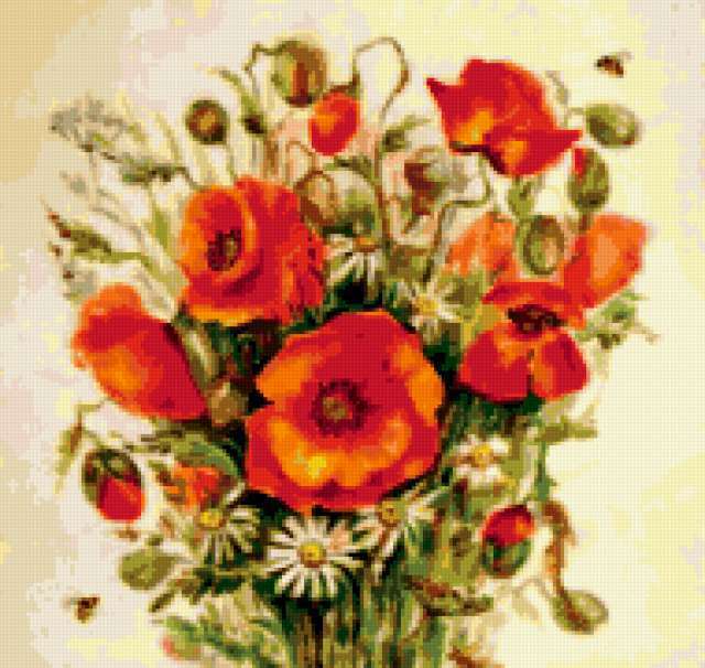 Ориентировочно так, схема вышивки «Unnamed-967340», созданная автором Minin, будет выглядеть при отшиве на канве. Размер данной вышивки равен 190x180 крестов, при этом используется 57 цветов. Ключевые слова, по которым можно найти эту схему: живопись, искусство, картина, природа, цветы, маки. Также, вы можете взглянуть на оригинальную картинку, соответствующую данной схеме вышивки.