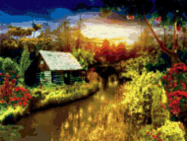 Ориентировочно так, схема вышивки «Unnamed-973329», созданная автором burova, будет выглядеть при отшиве на канве. Размер данной вышивки равен 190x143 крестов, при этом используется 85 цветов. Ключевые слова, по которым можно найти эту схему: пейзаж, природа, дома, речка. Также, вы можете взглянуть на оригинальную картинку, соответствующую данной схеме вышивки.