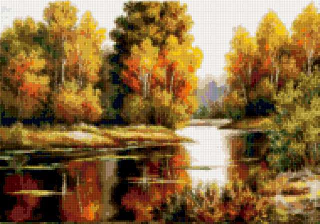 Ориентировочно так, схема вышивки «Unnamed-973522», созданная автором malkinaiv, будет выглядеть при отшиве на канве. Размер данной вышивки равен 190x133 крестов, при этом используется 50 цветов. Ключевые слова, по которым можно найти эту схему: картина, пейзаж, природа, пруд, озеро, деревья, осень, отражения. Также, вы можете взглянуть на оригинальную картинку, соответствующую данной схеме вышивки.