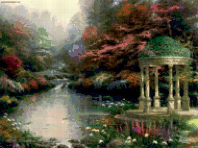Ориентировочно так, схема вышивки «Unnamed-976803», созданная автором malkinaiv, будет выглядеть при отшиве на канве. Размер данной вышивки равен 190x142 крестов, при этом используется 79 цветов. Ключевые слова, по которым можно найти эту схему: пейзаж, картина, пруд, озеро, цветы, беседка. Также, вы можете взглянуть на оригинальную картинку, соответствующую данной схеме вышивки.