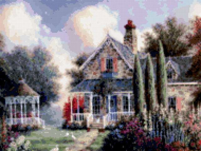 Ориентировочно так, схема вышивки «Unnamed-988427», созданная автором malkinaiv, будет выглядеть при отшиве на канве. Размер данной вышивки равен 190x143 крестов, при этом используется 75 цветов. Ключевые слова, по которым можно найти эту схему: картина, пейзаж, дома, домик, беседка, цветы, цветник. Также, вы можете взглянуть на оригинальную картинку, соответствующую данной схеме вышивки.