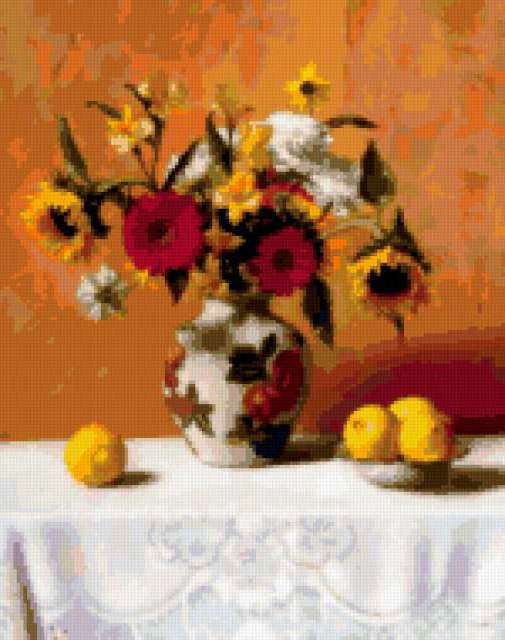 Ориентировочно так, схема вышивки «Unnamed-996246», созданная автором Luda49, будет выглядеть при отшиве на канве. Размер данной вышивки равен 150x190 крестов, при этом используется 64 цветов. К несчастью, автор не назначил для схемы ключевые слова. Также, вы можете взглянуть на оригинальную картинку, соответствующую данной схеме вышивки.