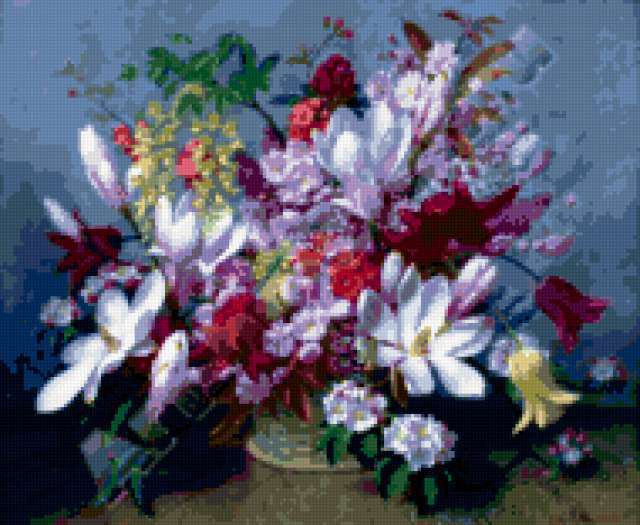 Ориентировочно так, схема вышивки «Unnamed-997746», созданная автором malkinaiv, будет выглядеть при отшиве на канве. Размер данной вышивки равен 190x156 крестов, при этом используется 63 цветов. Ключевые слова, по которым можно найти эту схему: искусство, живопись, картина, цветы, букет. Также, вы можете взглянуть на оригинальную картинку, соответствующую данной схеме вышивки.
