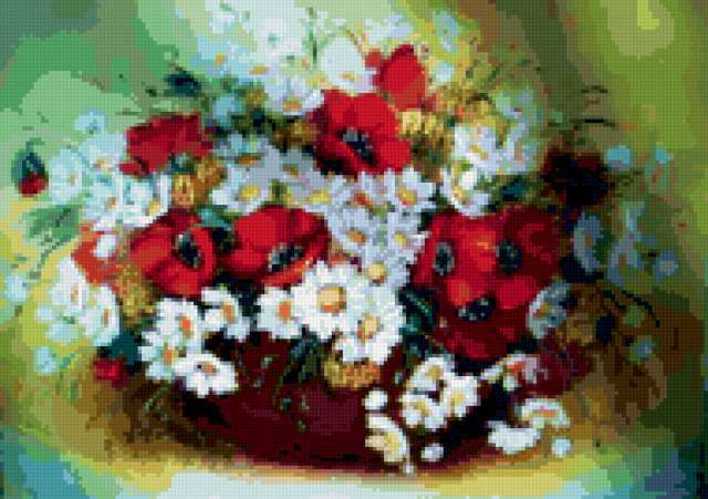 Ориентировочно так, схема вышивки «Unnamed-999083», созданная автором alyasha, будет выглядеть при отшиве на канве. Размер данной вышивки равен 190x134 крестов, при этом используется 68 цветов. Ключевые слова, по которым можно найти эту схему: цветы. Также, вы можете взглянуть на оригинальную картинку, соответствующую данной схеме вышивки.