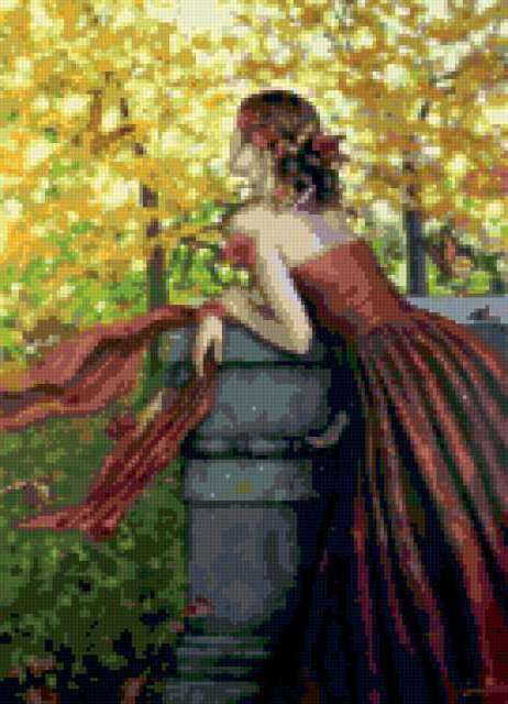 Ориентировочно так, схема вышивки «V ozidanii...», созданная автором lukrecija12, будет выглядеть при отшиве на канве. Размер данной вышивки равен 135x187 крестов, при этом используется 55 цветов. Ключевые слова, по которым можно найти эту схему: zenshina. Также, вы можете взглянуть на оригинальную картинку, соответствующую данной схеме вышивки.