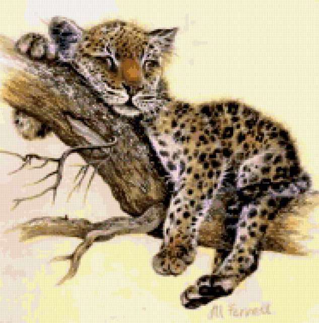 Ориентировочно так, схема вышивки «Variant 1», созданная автором Lamisa, будет выглядеть при отшиве на канве. Размер данной вышивки равен 186x188 крестов, при этом используется 66 цветов. Ключевые слова, по которым можно найти эту схему: животные, леопард, подушка. Также, вы можете взглянуть на оригинальную картинку, соответствующую данной схеме вышивки.